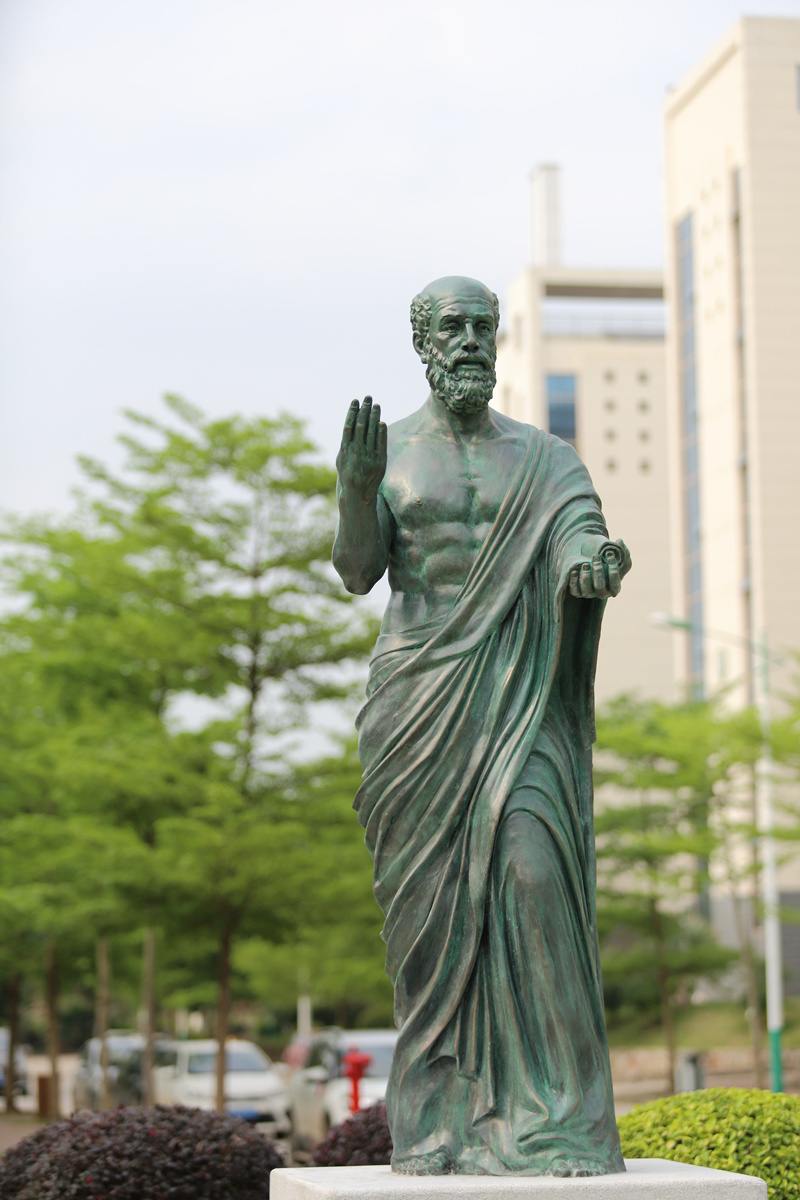 东西方医圣的对话,象征着东西方医学的光辉,昭示着广西中医药大学学人要传承与弘扬优秀医学文化基因,开启教育新风,回归常识、砥砺本领,回归本分、师德为先,回归初心、坚持正确的育人方向,回归梦想、实现教育报国和教育强国梦,建设高校教育和传统医学教育的新高地。