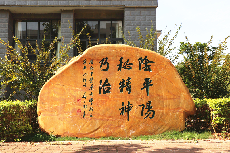 该石刻位于教学楼北面,由第七届中国书协主席、书法大家苏士澍先生为我校题写。语出《黄帝内经·素问》“阴平阳秘,精神乃治,阴阳离决,精气乃绝”。阴平阳秘,乃中医学治病最基本的法则。