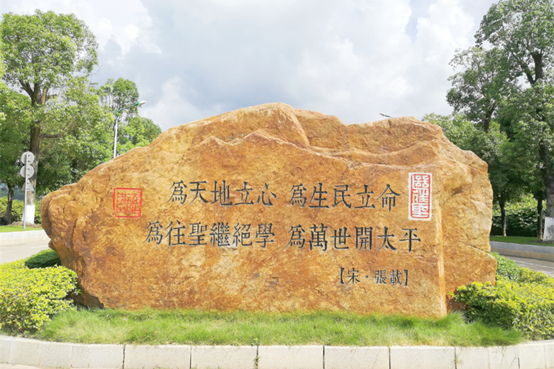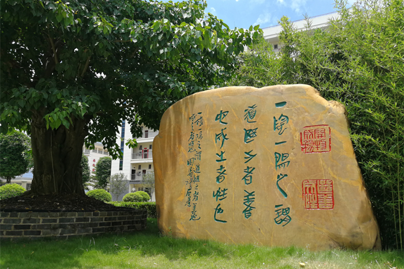 “一阴一阳之谓道,继之者善也,成之者性也。”语出《周易·系辞上》。由桂林市书协主席、全国书法大赛金奖获得者石墨先生为我校题写。现石刻右侧,两枚红色“开物成务”“继善成性”印章上下排列,亦为石墨先生所刻。