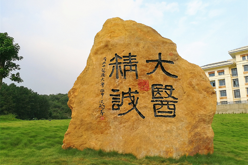 位于教学楼东侧,由中央国家机关书法家协会副主席、著名书法家丁嘉耕先生为我校题写。语出“医中之圣,方中之祖”张仲景的《伤寒杂病论》自序:“勤求古训,博采众方。”