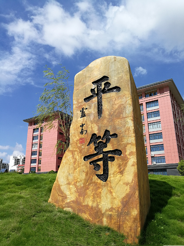 “平等”石刻位于阿平湖东侧,由楷书名家卢中南先生为我校题写。平等是人类社会理想境界的至高追求,也是社会主义核心价值观的基本要素,同时也是中华优秀传统文化人生观的共同理念。在学校空阔处耸立“平等”这样一块石刻是意味深长的,它意境上与相邻的“阿平湖”、“并育并行”、“天之道损有余而补不足”三石刻交相辉映,其“平等”二字还遥遥与远处“合德楼”主对联中的“碧碧湖水养慧心”的“慧心”二字密切相印,我们殷切期待着“平等”二字如同种子深深植入学子们的内心,潜移默化,最终使他们成长为身心健全的社会人。