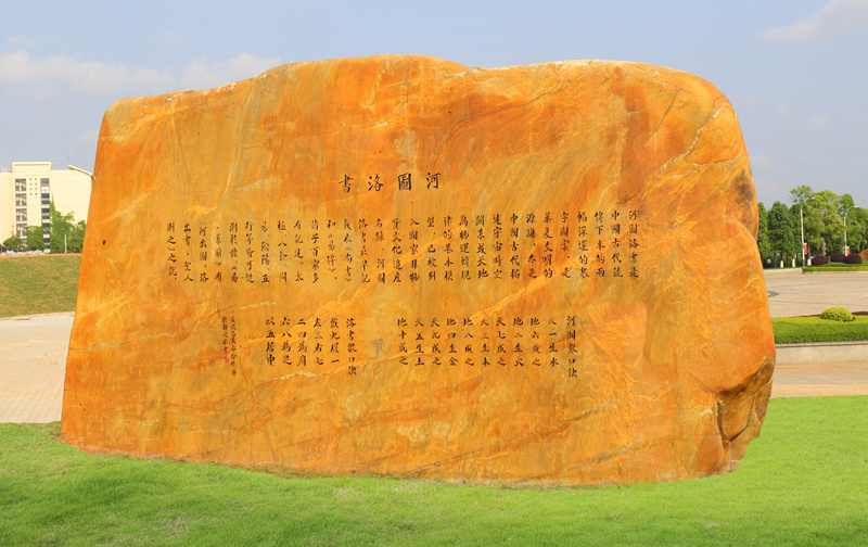 石刻背面刻有对河图洛书的解读:“河图洛书是中国古代流传下来的两幅深邃的数字图案,是华夏文明的源头,亦是中国古代描述宇宙时空关系或天地万物运转规律的基本模型,已被列入国家非物质文化遗产名录。河图洛书最早记载在《尚书》和《易传》,诸子百家多有记述。太极、八卦、周易、阴阳、五行等皆可追溯于兹。《易·系辞》有‘河出图,洛出书,圣人则之’之说。”由广西青年书法家协会主席唐楷之先生书写。