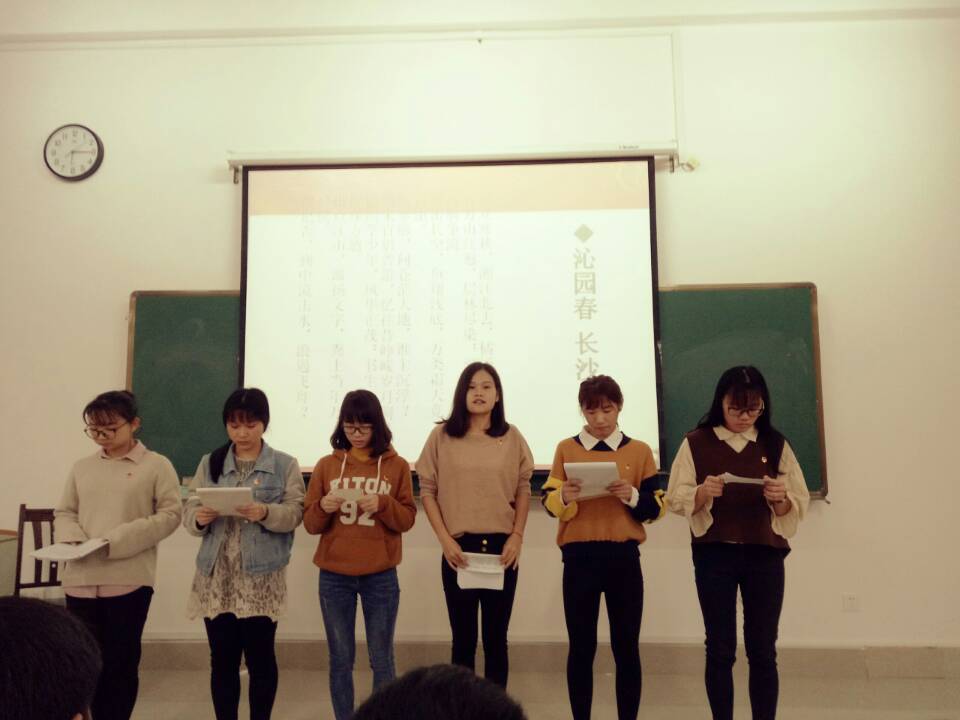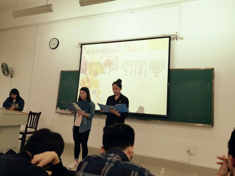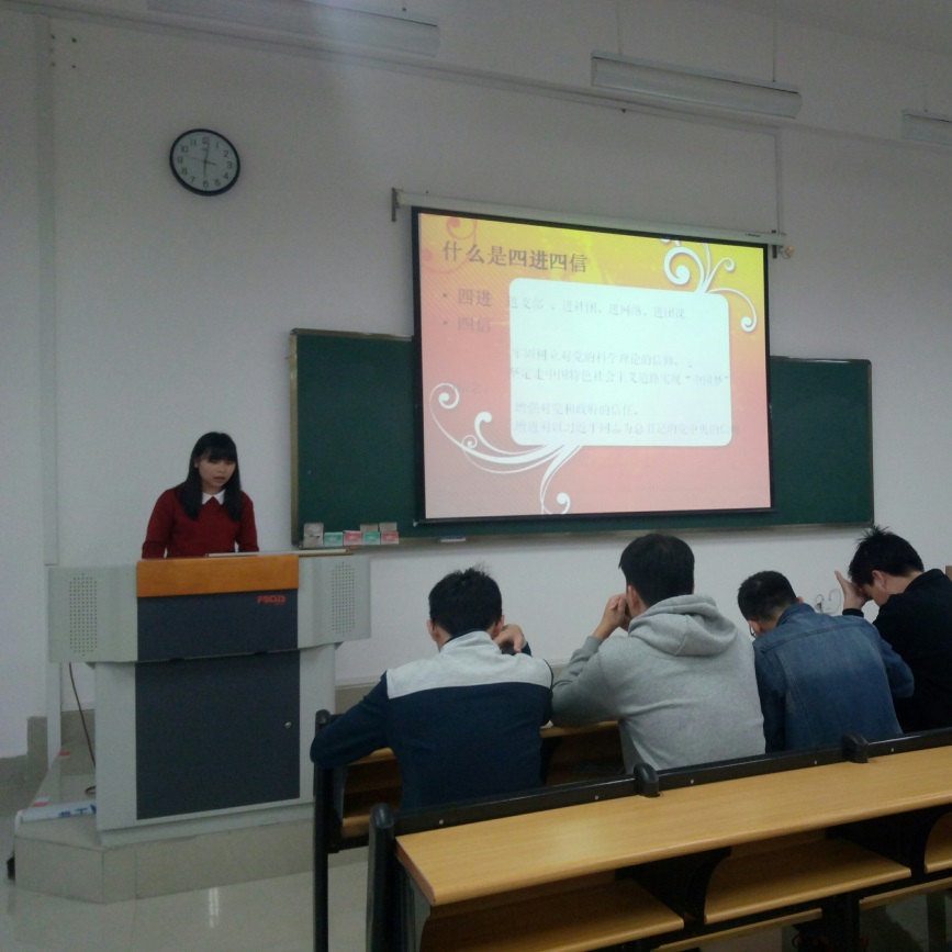 活动开始由团支书通过PPT讲解让同学们对四进四信的内容有所了解。为了让同学们进一步了解团日活动的目的,以朗诵诗歌的形势来让大家深入了解。以宿舍为单位来进行诗歌朗诵,同学们充满激情的朗诵诗歌配上优美的音乐,让大家更能体会到诗歌里蕴藏的情感。