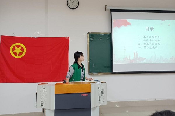 ,团支书梁立梅以一个简短的视频向团员们介绍五四运动爆发的原因,让团员们五四运动的时代背景有了初步了解;紧接着带领同学们学习“五四”精神的核心内容,激发团员们的爱国热情和奋斗精神;随后带领团员们重温了入团仪式最后通过小组朗诵、小组合唱和小组情景剧等形式为此次“五四”青年节献礼。