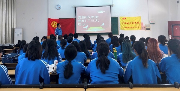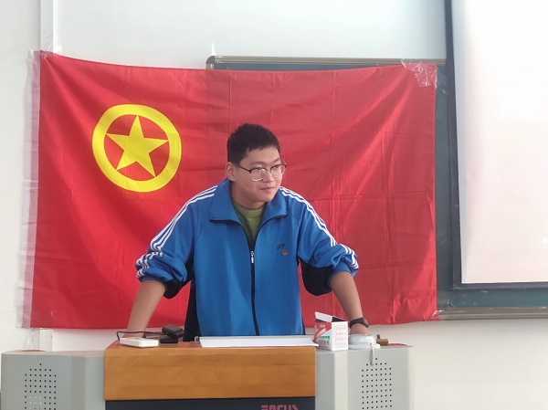 活动伊始,王超带领同学们一起唱响团歌,学习新时代伟大成就的相关知识,强化理论武装,赓续红色精神。会上,王超向同学们介绍了党的十八大以来中国共产党团结带领中国人民取得的历史性成就、发生的历史性变革,从以下六个方面认识新时代中国特色社会主义的伟大成就:“在国防和军队建设上、在坚持‘一国两制’和推进祖国统一上、在维护国家安全上、在社会建设上、在生态文明建设上、在全面依法治国上”。最后支部团员陈婕兰、王吉峰分别结合自身经历,分享了近年来国家取得伟大成就带给自己的切身感受。