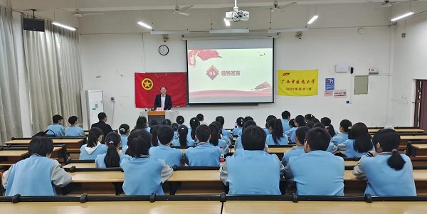 作为2022级药学1班的处级干部班级联系人,钟勇老师从中国近代苦难曲折、建国后的辉煌成就以及学习习近平总书记在二十大广西代表团讲话精神三个方面进行发言,并寄语同学们端正学习目标,树立良好学习态度,趁风华正茂,挥斥方遒,不负党与国家的期望,努力成为社会主义的合格建设者和可靠接班人。