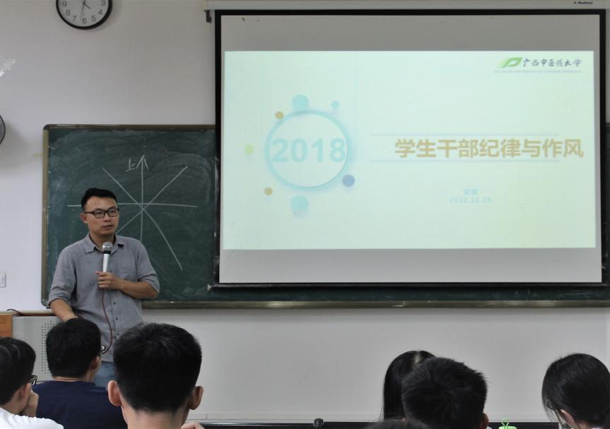 2018年10月26日12:10,药学院团委书记黄鑫老师就“学生干部纪律与作风”问题在仙葫校区教学楼1-116室开展教育会。药学院党委副书记李豫萍老师,药学院学生工作办公室主任凌勇威老师出席本次座谈会。参与此次座谈会的还有药学院团委学生会、药学院四大社团及药学院大学生通讯社的部长级及以上成员。