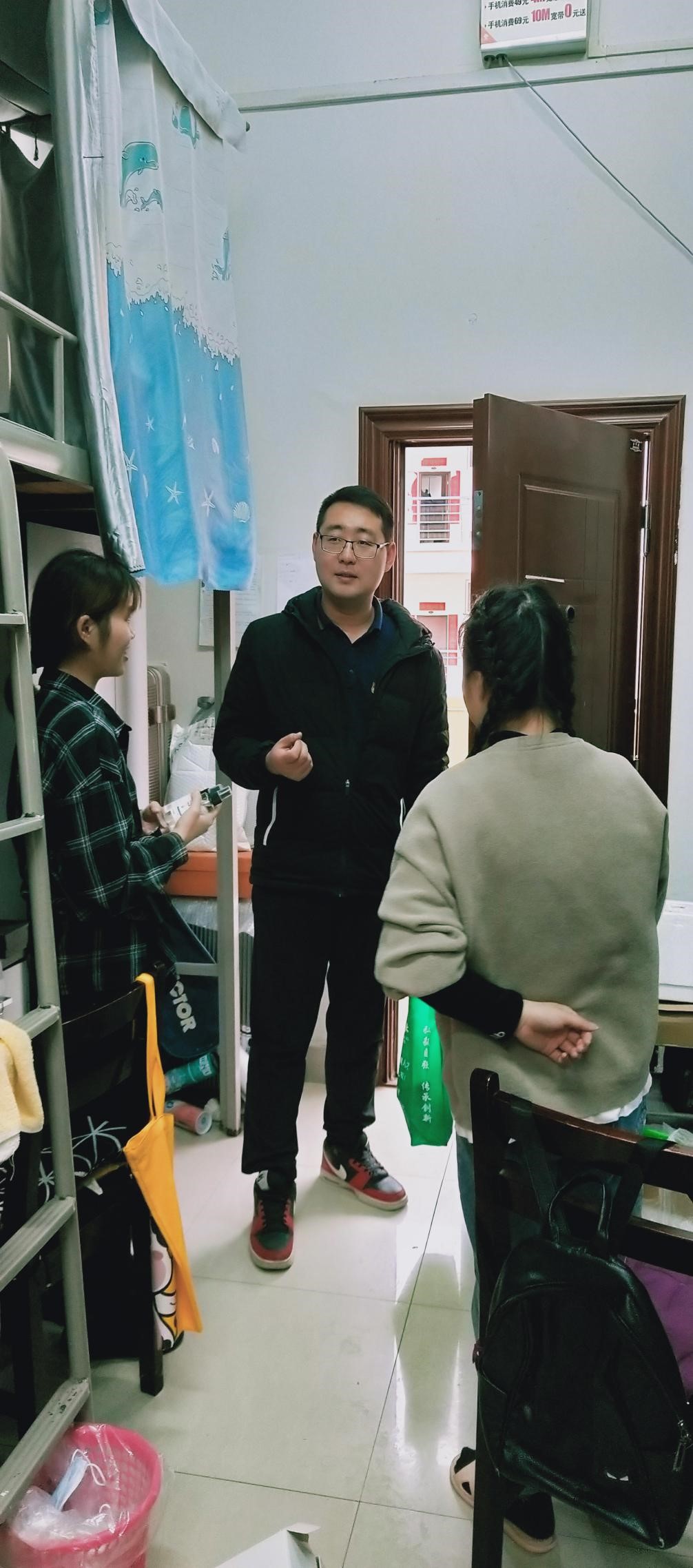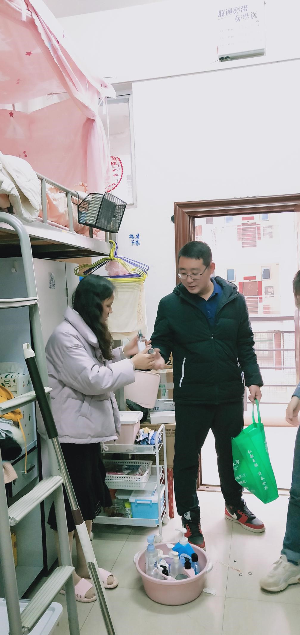 走访过程中,刘航老师与宿舍同学进行了亲切交谈,了解各个宿舍到校情况,并向每间宿舍发放了一定量的消毒物资。交谈中,辅导员热心提醒同学们在回南天里注意防潮,注意饮食卫生安全,上下楼梯注意安全,避免打滑摔跤。随后,对于就部分同学在考研备考、就业选择以及职业规划等方面有困惑的情况,刘航老师现场进行一对一答疑和辅导,鼓励同学要心怀理想,志存高远,相互帮助,共同进步,将个人价值追求融入到祖国的发展大局中,把个人梦融入中国梦,实现人生价值;并叮嘱同学们要注意保持宿舍的整洁,按时使用消毒物资,调整学习作息规律,合理安排学习时间,锻炼身体注意劳逸结合。