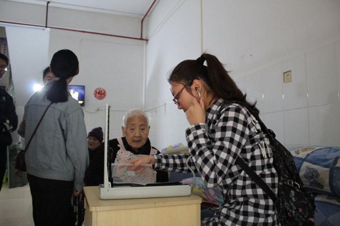 药学院第三学生党支部的党员帮老人测量血压
