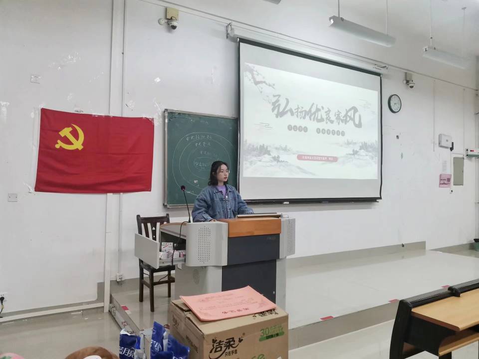 本次活动由支部书记孙慧玲老师带大家学习,由宣传委员申雨同志主持开展“弘扬优良家风”主题党课,由支部副书记苏嘉福同志带领学习“诚信考试,党员先行”理论知识,并对在支部12月“诚信考试,党员先行”主题活动中表现突出的同学给予表彰。