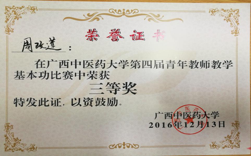 2016年12月13日,在仙葫校区教室举行的广西中医药大学第四届青年教师教学基本功比赛中,我科室周改莲获三等奖并同时获得最佳教学设计奖。我校举办的青年教师教学基本功大赛已成为我校青年教师互相交流、学习和展示的一个重要平台,本次比赛教学内容丰富,参与范围广泛,参赛青年教师教学水平,特别是PPT制作水平明显提高。学校举办的基本功比赛有效地促进了青年教师教育教学能力的提升,进一步调动了青年教师投身教学工作的积极性和主动性,达到了相互借鉴、共同提高的目的。