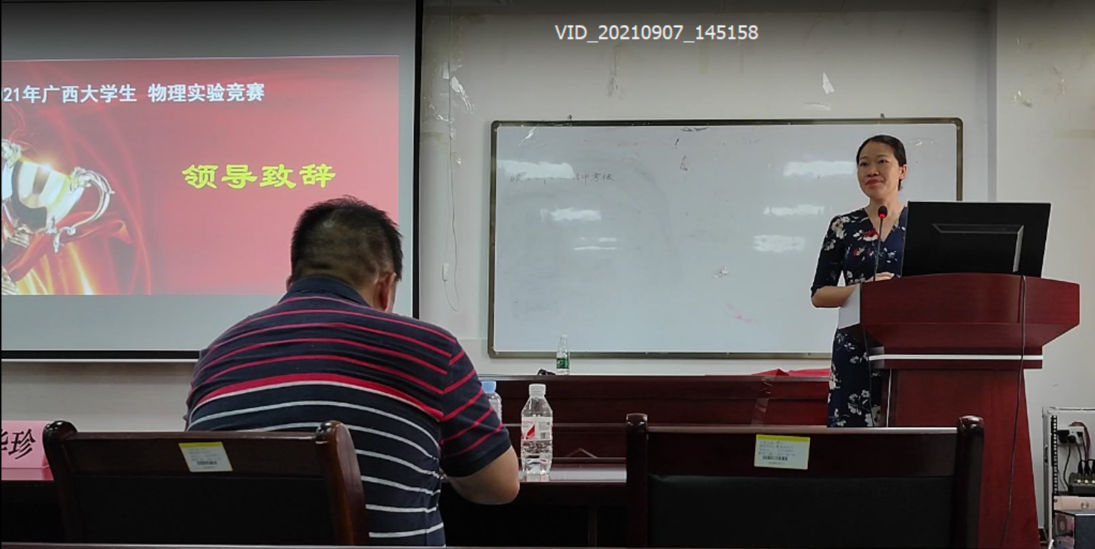 韦相忠主任首先介绍了我校参加2021年大学生物理实验竞赛的情况,并对支持组织学生参加的领导和老师们表示感谢,并鼓励在场的同学积极参与该类竞赛。随后莫雪妮处长、秦华珍副院长、李豫萍副书记对获奖同学进行了表彰。接着优秀选手代表周维研同学发表了获奖感言,她向大家分享了自己的参赛经验并预祝今年参加国赛的队员能够在比赛中取得优异成绩。最后,莫雪妮处长对本次比赛获奖选手表示祝贺,鼓励同学们多参加这类学科竞赛,充分锻炼自己各方面的能力,不断丰富自己的大学生活,为我们学校的快速发展做出自己的贡献。