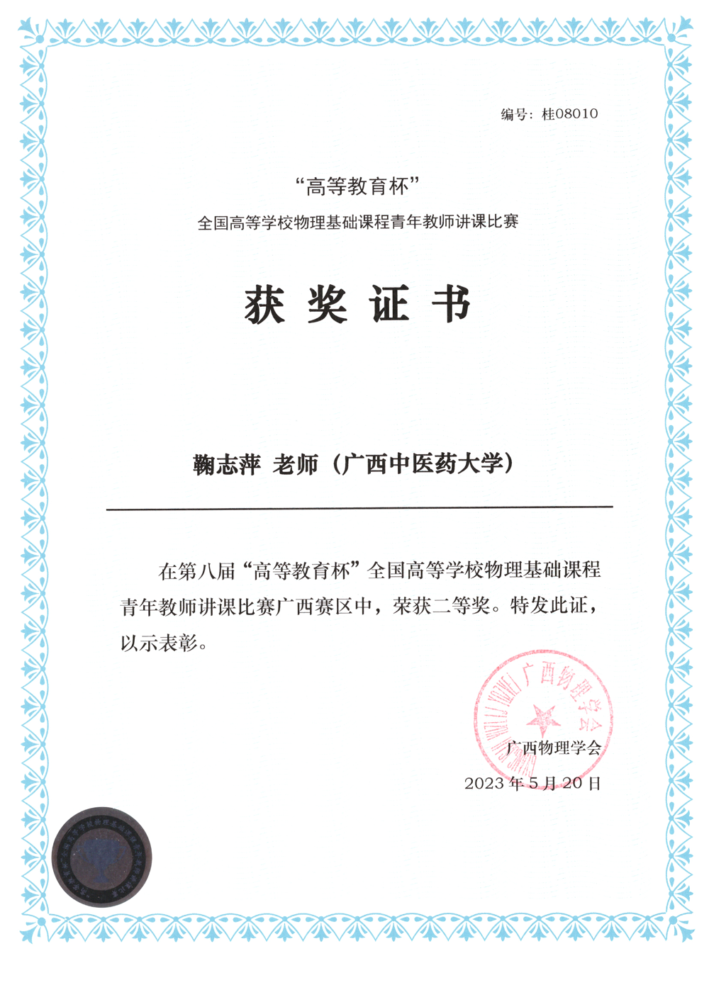 药学院鞠志萍老师获得2023年大学物理基础课程讲课比赛广西二等奖