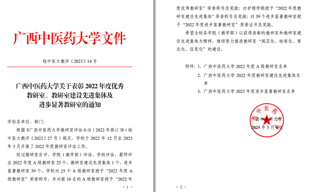 图1 广西中医药大学关于表彰2022年度优秀、建设先进集体及进步显著教研室的通知
