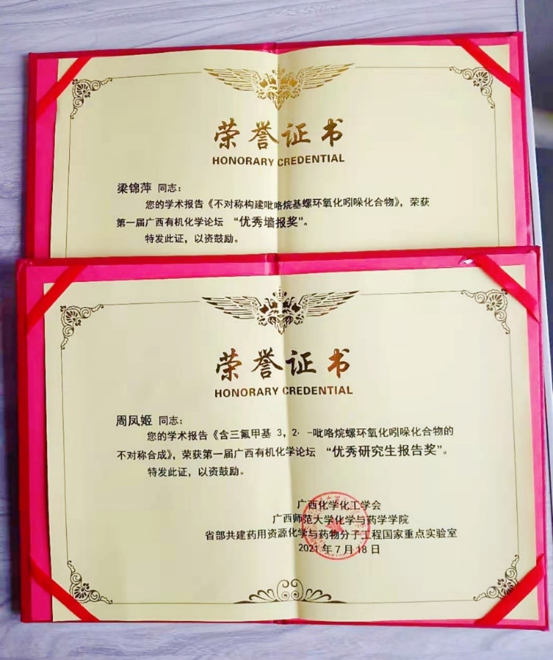 2021年7月,药学院药物化学教研室主任林宁教授带领学生参加由广西师范大学承办的第一届广西有机化学论坛,并受邀做了“邮寄催化串联反应策略不对称构建螺环氧化吲哚”主题的学术报告。同行参会学生刘水丽、黄静玲和周凤姬3名研究生分别做了主题为《一例新型方酰胺构筑的金属有机框架在吲哚骨架化合物合成中的应用》、《脱氢枞酸衍生的方酰胺类化合物合成及其相关生物活性研究》及《三氟甲基3,2-吡咯烷螺环氧化吲哚化合物的不对称合成》的学术报告,何金芝和梁锦萍2名同学分别做了主题为《苯并二氢吡喃螺环氧化吲哚化合物的设计、合成及抗肿瘤活性研究》和《不对称构建吡咯烷基螺环氧化吲哚化合物》的墙报展示,其中,周凤姬和梁锦萍2位同学分别荣获“优秀研究生报告奖”和“优秀墙报奖”。向广西师范大学的师生及参会其他高校(清华大学、广西大学、赣南师范大学、广西民族大学、桂林电子科技大学、南宁师范大学、五邑大学、桂林医学院等)展示了广西中医药大学药学生的创新科研能力。