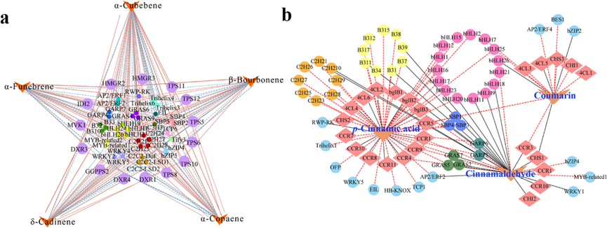 图4肉桂中萜类和苯丙素类生物合成途径的调控网络图。a. 萜类生物合成途径; b. 苯丙素类生物合成途径。