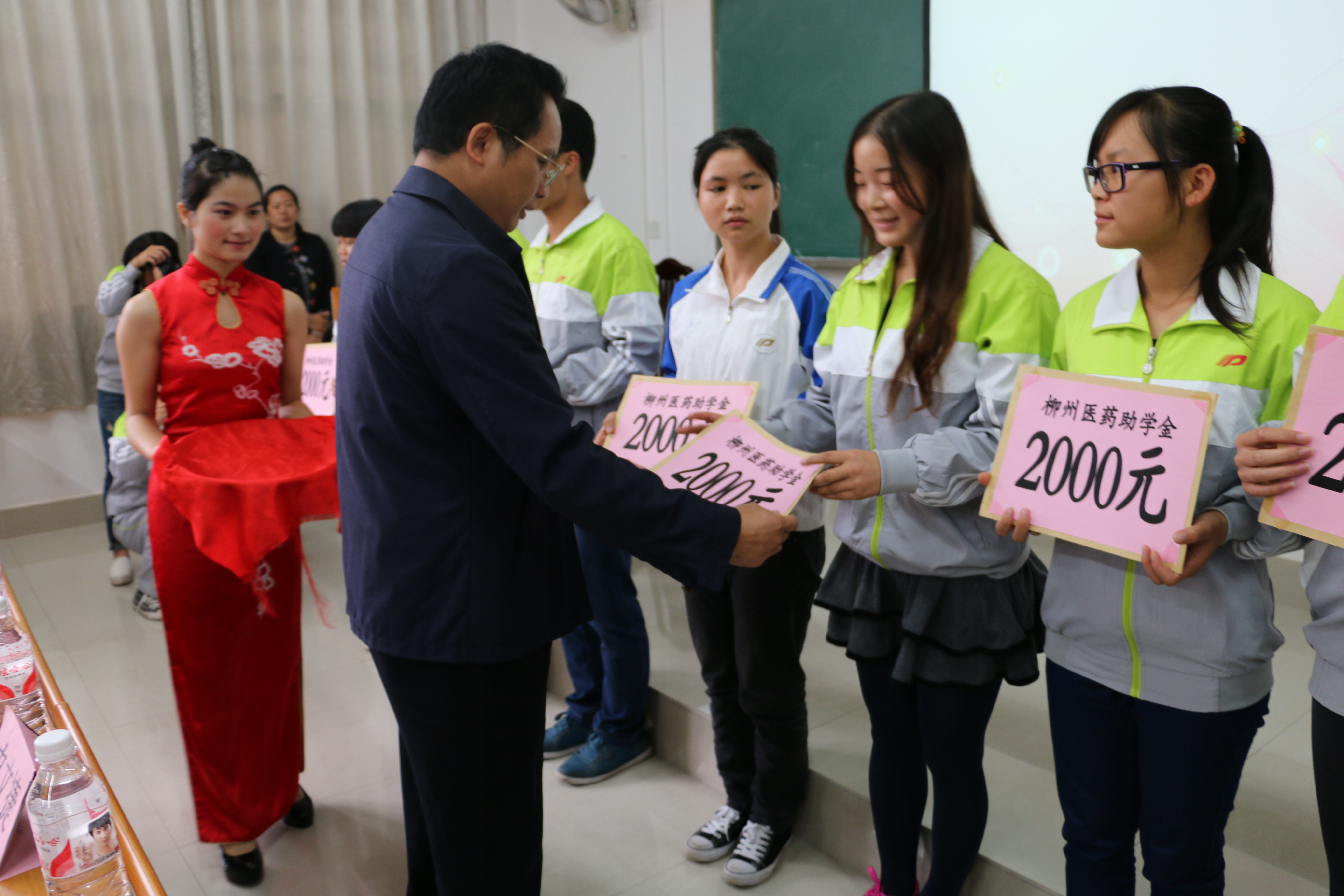 2015年11月3日下午,广西柳州国药股份有限公司奖助学金颁奖仪式在仙葫校区1栋404教室顺利举行。广西中医药大学党委常委、总会计师何刚亮、广西柳州医药股份有限公司副总经理申文捷为2015年获得柳州医药奖助学金的25名学生颁发了5万元的助学金
