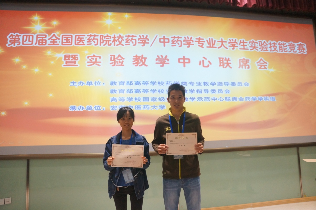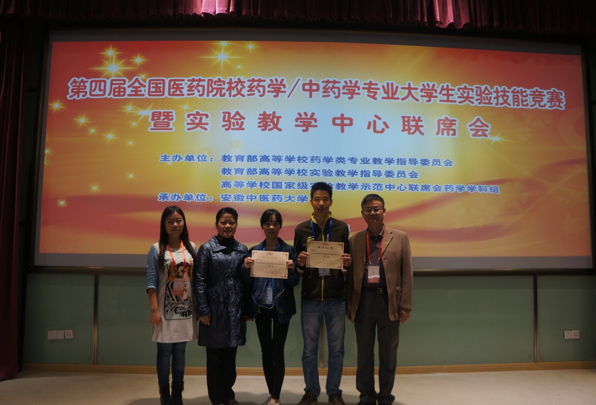 为了充分认识实验教学在培养学生综合素质和创新能力、塑造学生学术道德和科研品格过程中的重要作用,进一步强化我国高校药学/中药学专业实验教学工作,提升学生实验动手和实践创新能力,加强校际交流与合作,教育部高等学校药学类专业教学指导委员会、教育部高等学校实验教学指导委员会、国家级实验教学示范中心联席会药学学科组于2015年11月5-7日在安徽中医药大学举办“第四届全国医药院校药学/中药学专业大学生实验技能竞赛”。我校派出由陈勇院长带队,秦华珍副院长、林瑜老师、2012级中药学专业谭德超同学、2012级中药资源与开发专业巫柳岑同学组成的参赛队参加了比赛。