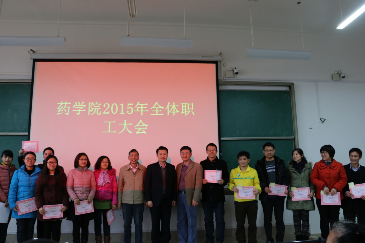 2016年1月13日下午,药学院在仙葫校区教学楼1-303教室召开药学院2015年年度工作总结暨表彰先进会,药学院全体教职工参会,庞宇舟副校长出席大会并发言。会议由药学院党委王勤书记主持。