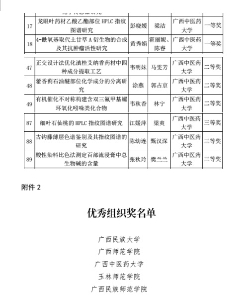 我院在第十九届广西高校大学生化学化工类学术创新成果中喜获佳绩 来源:药学院 发布时间:2018-10-16 16:34:47 浏览次数: 次 【字体:小 大】 第十九届广西高校大学生化学化工类学术创新成果大赛已圆满结束,本届竞赛全区共有23所高校、4000多名在校大学生参赛,我院荣获一等奖两名,彭晓媛、黄秀娟,指导老师梁洁、霍丽妮;二等奖三名,韦明妹、涂燕、韦秋香,指导老师马雯芳、郭占京、林宁;三等奖三名,江媛萍、陈幼连、张秋玲、指导老师梁爽、甄汉深、樊兰兰,同时也取得优秀组织奖荣誉。 分享到: 【打印正文】