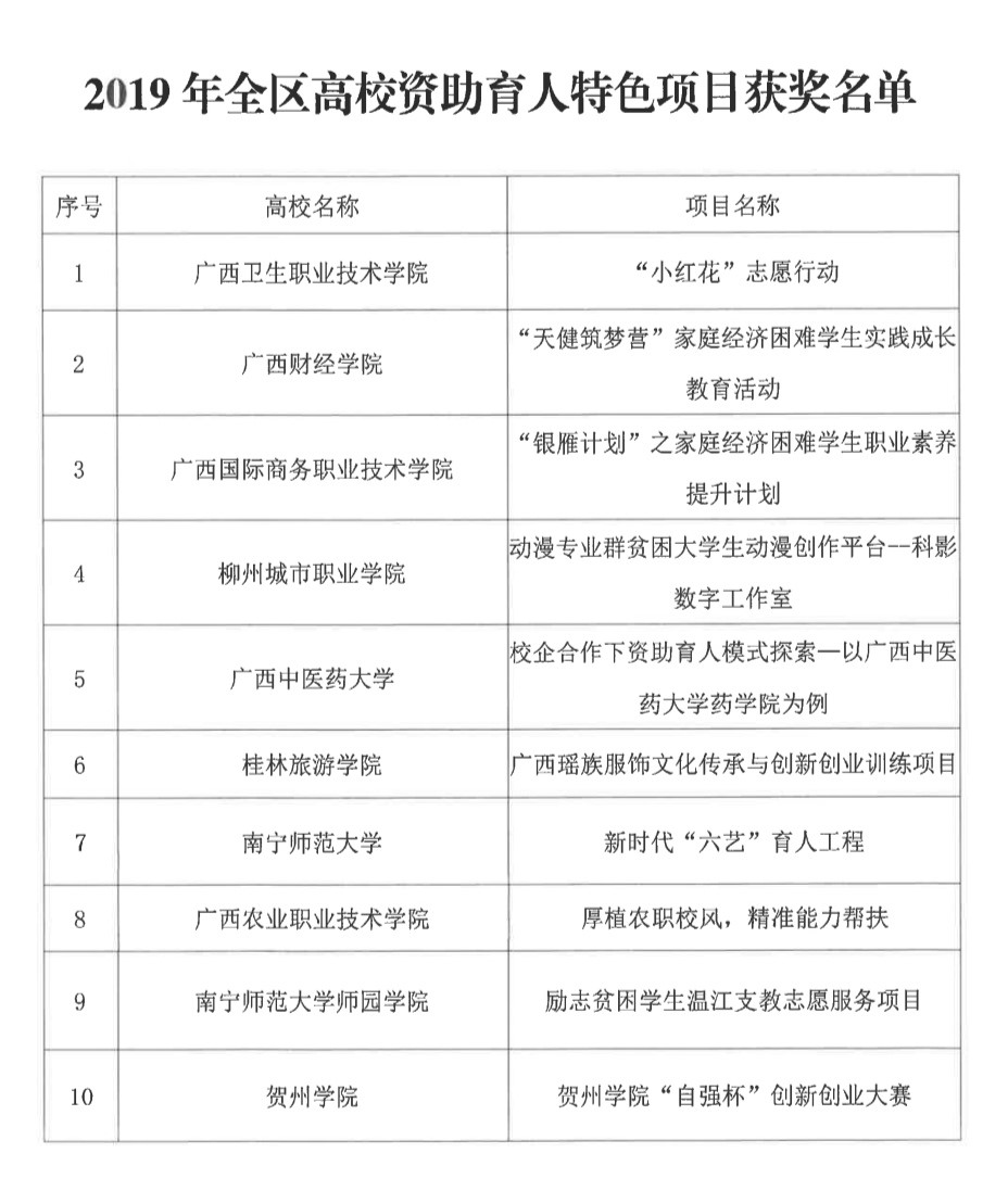 【喜讯】药学院荣获全区高校资助育人特色项目 来源:药学院 作者:王宗耀 发布时间:2019-12-30 17:32:59 浏览次数: 次 【字体:小 大】 近日,2019年全区资助育人项目和工作典型案例评选获奖名单已由广西壮族自治区教育厅公布,我院申报项目“校企合作下资助育人模式探索——以广西中医药大学药学院为例”荣获2019年全区高校资助育人特色项目的称号。 谨此祝贺我院今年在资助育人方面取得的成绩,希望全体项目人员认真总结申报经验,推动我院“三全育人”工作再上新台阶。 分享到: 【打印正文】