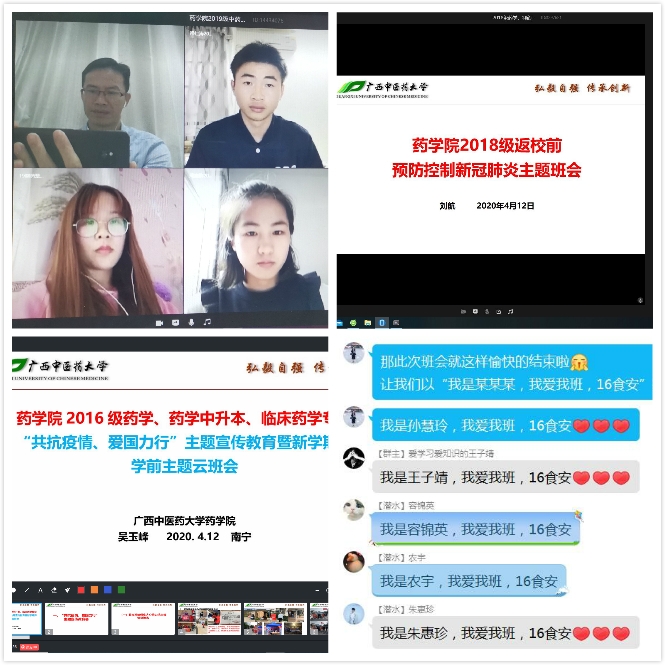 会上,同学们通过视频、语音、发弹幕等方式积极踊跃参与到班会中。2016级药学二班梁英隆同学说:“新冠肺炎疫情发生以来,广西推动中医药深度参与疫情防控并且取得了很好的成效,今后我们要更加努力学好中医药知识,为守护好人民群众的健康添砖加瓦。”2019级中药学梁仁涛同学表示:“我们会严格按照学校的要求,在返校前坚持每天上健康系统打卡,减少外出,不让学校和老师担心,认真履行一名大学生在疫情期间应尽的义务。”