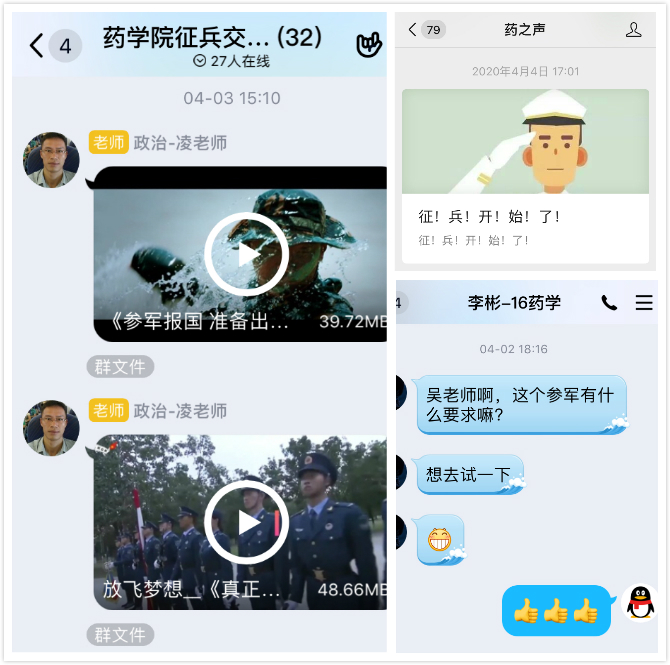为贯彻落实我校2020年征兵工作会议精神,积极引导在校生参军入伍,4月以来,药学院各年级自上而下开展了一次广泛深入的大学生征兵宣传动员,同学们参军入伍热情高涨,截至目前已有11名男生提交应征意愿。