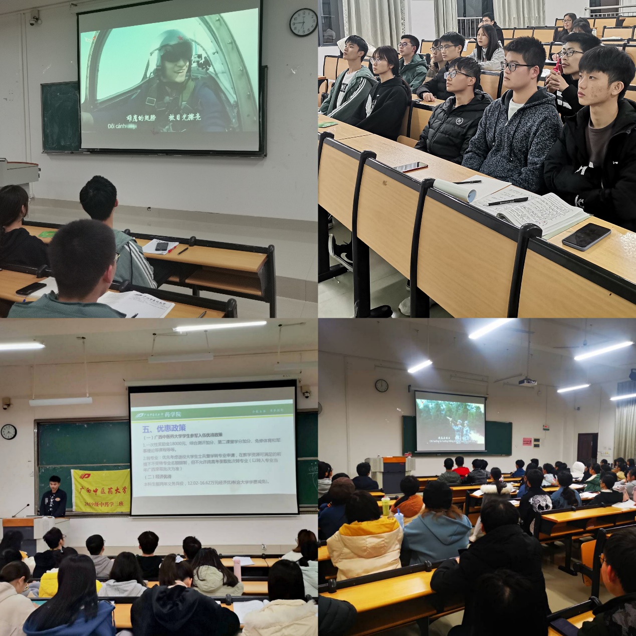 2020年,药学院有4名男生光荣参军入伍,超额完成上级部门下达的征兵任务,荣获学校2020年度征兵工作先进单位荣誉。2021年春季征兵开始后,药学院深入贯彻落实学校征兵工作会议精神,利用周末晚点名、主题班会在5个年级、42个班级深入开展征兵政策宣讲活动,并隆重举行1场征兵动员大会。