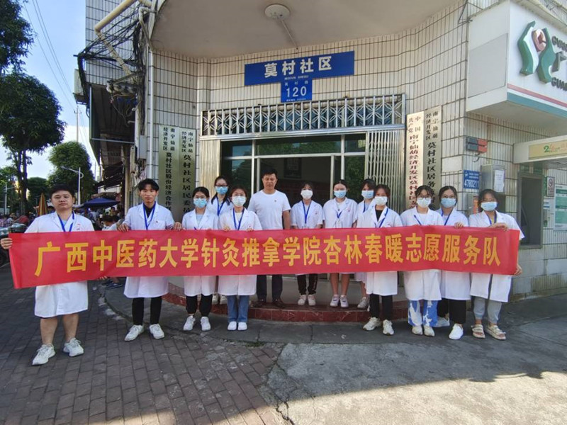 为了积极响应国家号召,以青春奋进新时代,弘扬“奉献、友爱、互助、进步”的志愿者精神,自觉以习近平新时代中国特色社会主义思想武装头脑,坚定不移地跟党走。2022年7月14日,广西中医药大学针灸推拿学院杏林春暖队于南宁市仙葫管委会莫村社区开展了义诊服务活动。
