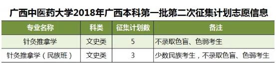 2018年征集志愿-广西本科第一批(第二次征集) 发布时间:2018-07-17 19:28:40 浏览次数: 次 【字体:小 大】 我校此次将征集针灸推拿学,针灸推拿学(民族班)等专业计划共8名,详情如下: 征集志愿填报时间:7月18日18时至7月19日9时,请考生在规定时间内进入广西招生考试院官网(http://www.gxeea.cn)“2018年普通高校招生志愿填报”填报征集志愿,并保证在征集志愿填报、投档及录取期间保持报名时所留联系电话畅通。详情请点击“征集志愿”。 分享到: 【打印正文】