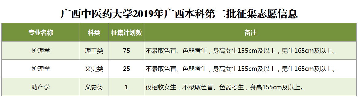 2019年征集志愿-广西本科第二批 发布时间:2019-07-25 10:44:13 浏览次数: 次 【字体:小 大】 我校本次将征集护理学、助产学等专业计划共101名,详情如下: 征集志愿填报时间:7月25日下午18:30至26日上午9:00,请考生在规定时间内到广西招生考试院官网(http://www.gxeea.cn)进入“2019年普通高等学校招生志愿填报”填报征集志愿,并在录取期间保持报名时所留联系电话畅通。 详情请点击“征集志愿”。 分享到: 【打印正文】