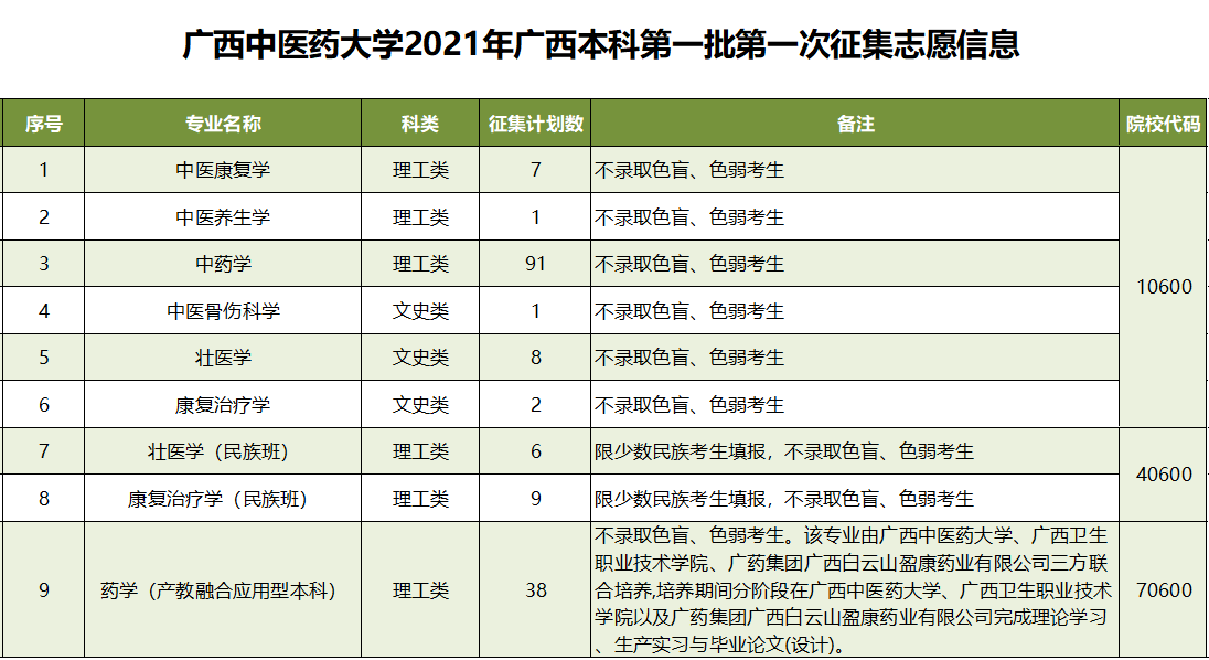 我校本次将征集中医康复学、中医养生学、中药学、中医骨伤科学、壮医学、壮医学(民族班)、康复治疗学、康复治疗学(民族班)、药学(产教融合应用型本科)专业计划共163名,详情如下: