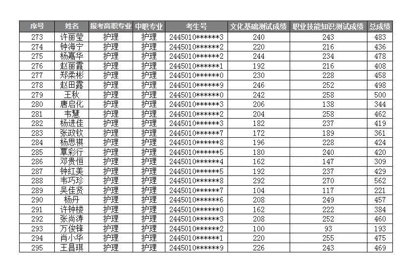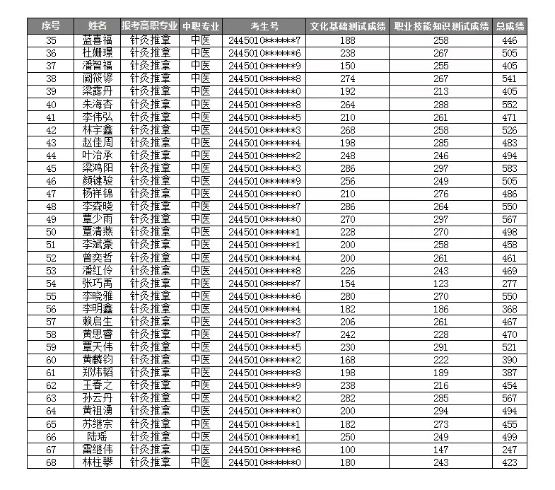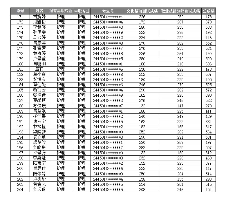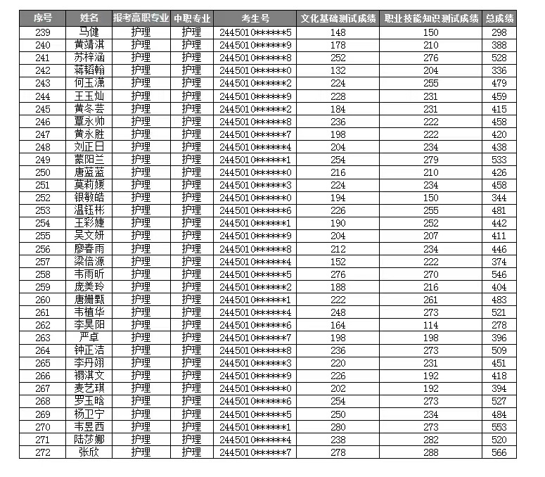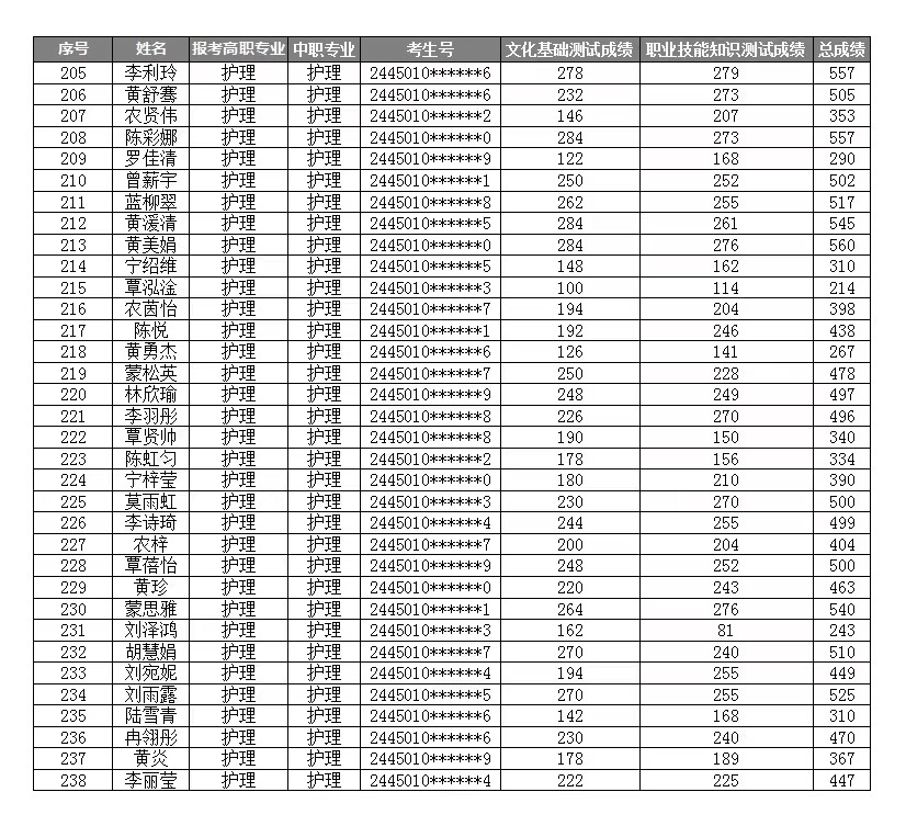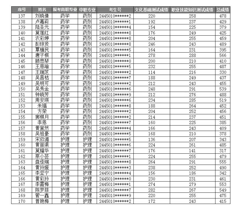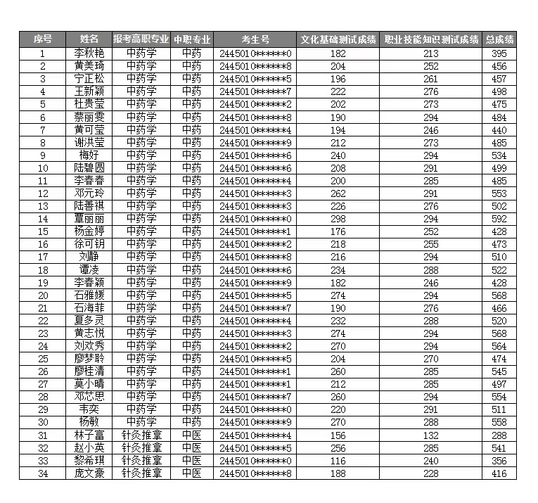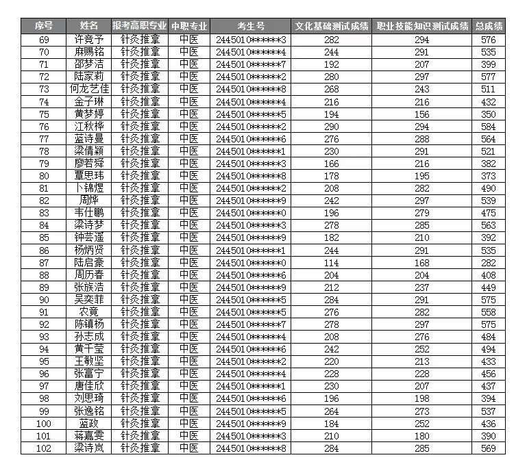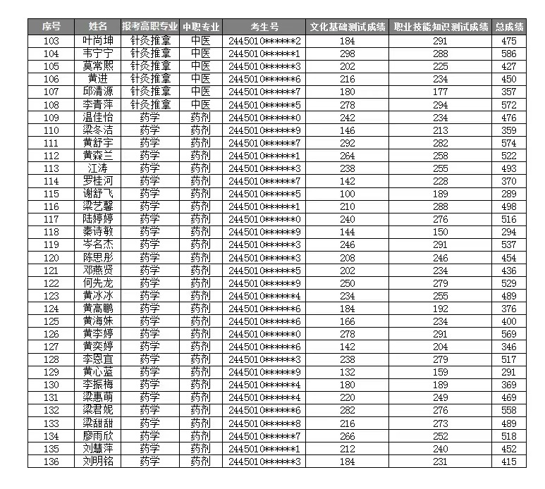 广西中医药大学2024年高职对口中职(“2+3”直升)自主招生考试成绩表
