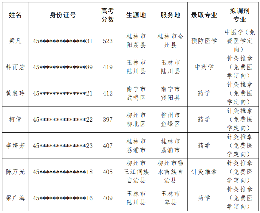 根据《自治区卫生健康委自治区教育厅自治区人力资源社会保障厅自治区中医药局关于调整农村订单定向医学生免费培养项目招录事项的通知》(桂卫科教发〔2022〕2号)以及我校《关于全面完成2024年农村订单定向医学生免费培养招生任务的通知》等文件精神,经学生自愿报名、学校资格审查,拟将2024级梁凡同学的录取专业调剂为本科中医学(免费医学定向)专业,拟将2024级钟雨宏等六名同学的录取专业调剂为高职针灸推拿(免费医学定向)专业,现将名单公示如下: