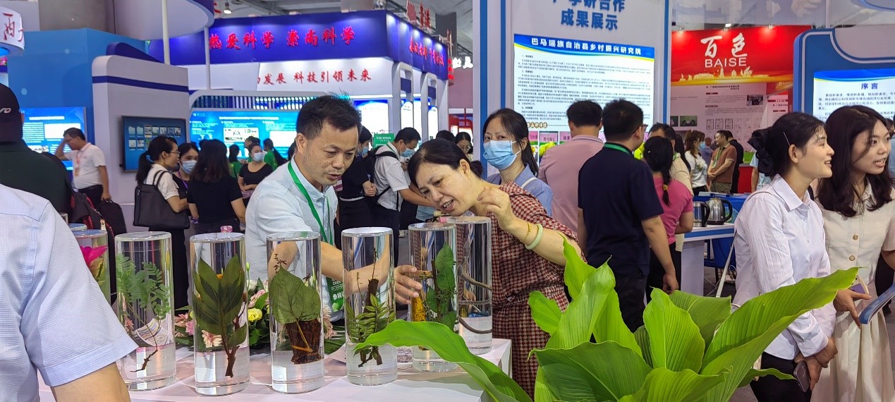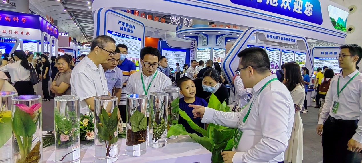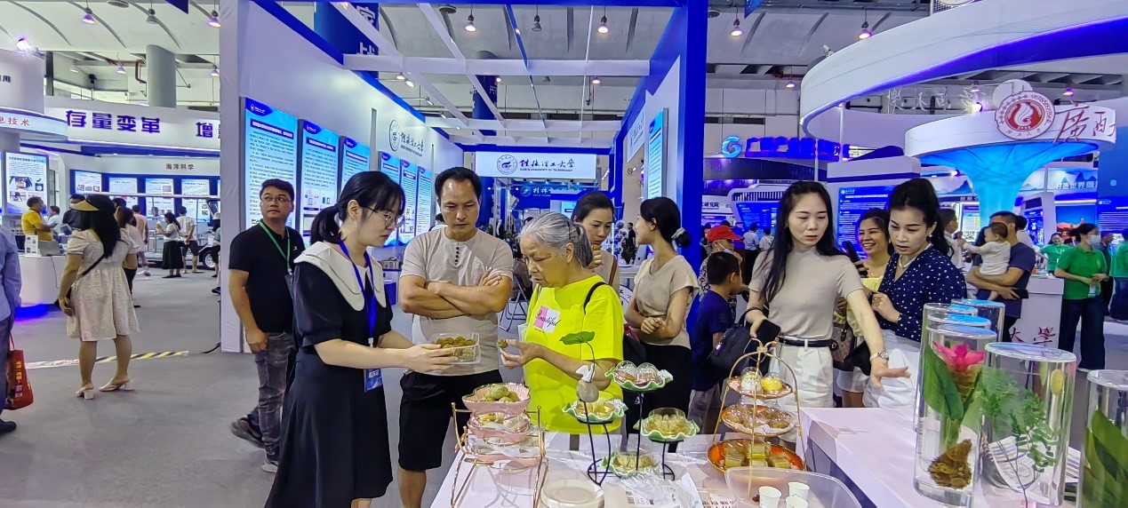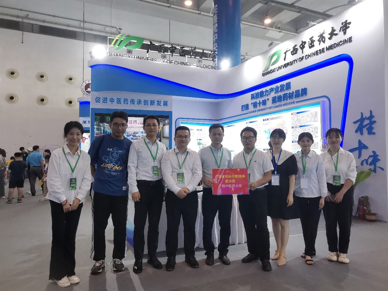 我平台成员赴广西科技“两周一展”广西中医药大学展区进行科普宣讲。广西中医药大学展区通过展板图文并茂展示广西中药资源、“桂十味”道地药材种植概况等,也以实物形式展现我校今年取得1.1类中药创新药临床批件的止得咳颗粒、十一方药酒,还有其它中医药大健康产品如复方扶芳藤合剂、八桂天龙丸等。我校展区还设有八段锦展示、试吃药膳、赠送香囊等活动。实验室成员向看展观众介绍了“桂十味”道地药材、瑶药产后泡浴等产品、并为观众分发药膳、糕点。此次活动吸引了不少过往观众驻足围观、品味,从多个维度感受到中医药文化的魅力。