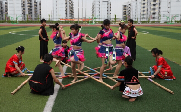 壮医药学院“壮族传统民俗文化”活动由壮族竹竿舞欣赏和壮族传统体育竞赛两个部分组成。在欢快的壮语山歌中,具有壮族特色的竹竿舞拉开了活动的序幕,鲜艳、 美丽的壮族服饰和清脆、响亮的竹竿声引人耳目。而“疯狂的竹竿“、板鞋竞走、背篓接绣球等这些具有浓郁壮族特色的竞赛项目,更是获得了周围学生们的阵阵掌声。